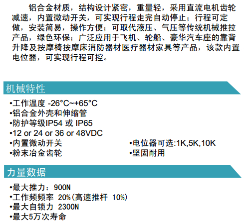 鋁合金材質(zhì),結(jié)構(gòu)設(shè)計(jì)緊密,重量輕,采用直流電機(jī)齒輪減速,內(nèi)置微動開關(guān),可實(shí)現(xiàn)行程走完自動停止;行程可定做,安裝簡易,操作方便;可取代液壓、氣壓等傳統(tǒng)機(jī)械推拉產(chǎn)品,綠色環(huán)保;廣泛應(yīng)用于飛機(jī)、輪船、豪華汽車座的靠背升降及按摩椅按摩床消防器材醫(yī)療器材家具等產(chǎn)品,該款內(nèi)置電位器,可實(shí)現(xiàn)行程可控。